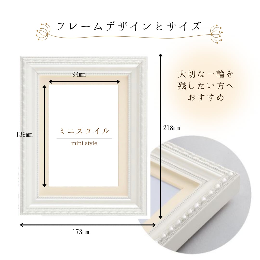 1〜3輪のお花を残すデザインで、コンパクトなフレームで飾る場所にも困らず少輪数の花束を残したい方におすすめです。