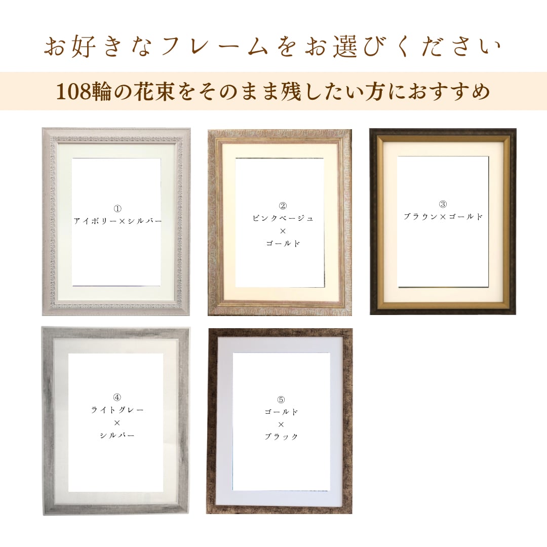 70〜108輪の花束を、そのままのブーケの形に残すデザインで贈られた時の感動を長く楽しめます。
