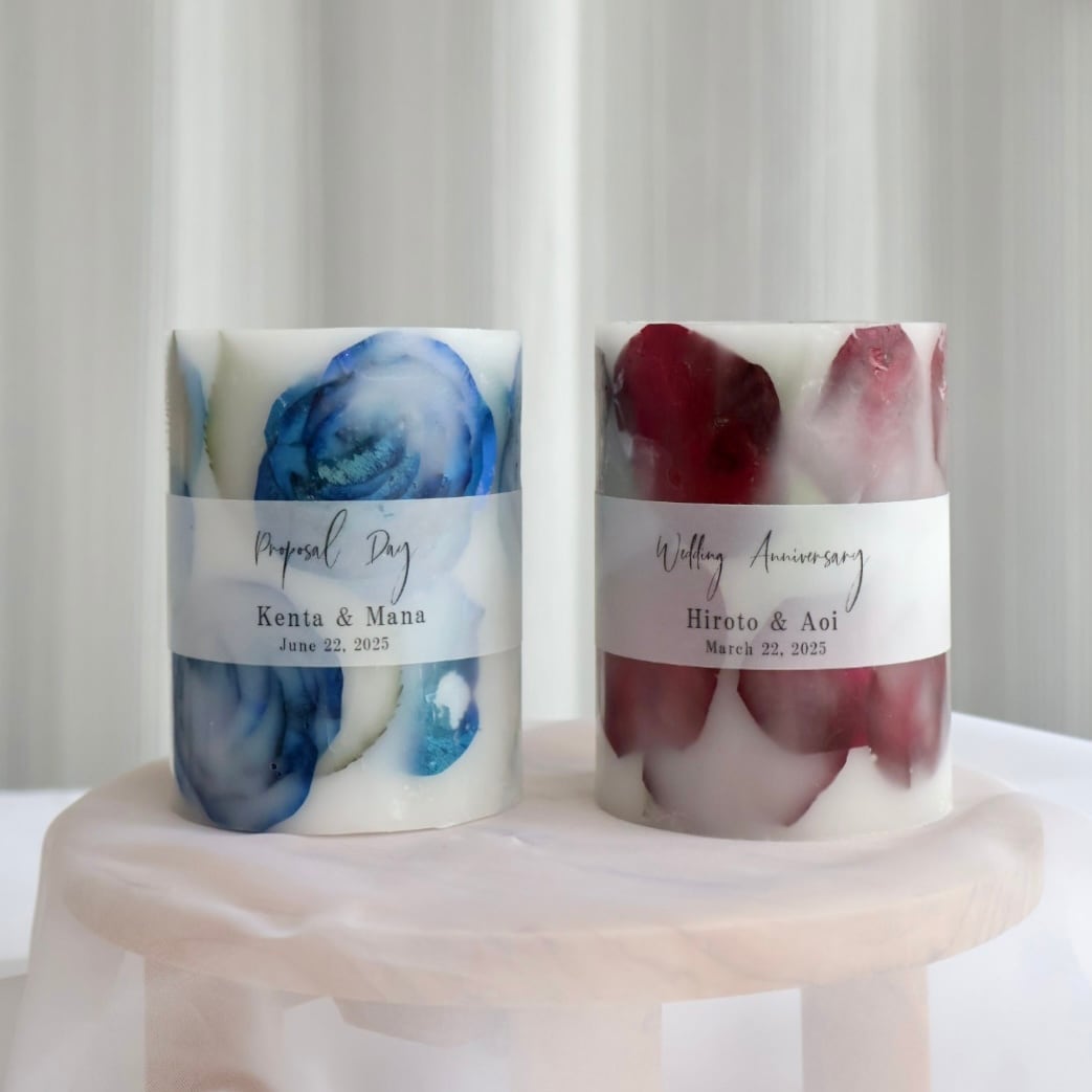 当店ではウェディングブーケやプロポーズの花束各種お祝いのお花から、身近に咲いたお花までお客様の大切なお花をお預かりして押し花に加工しキャンドルにしております。